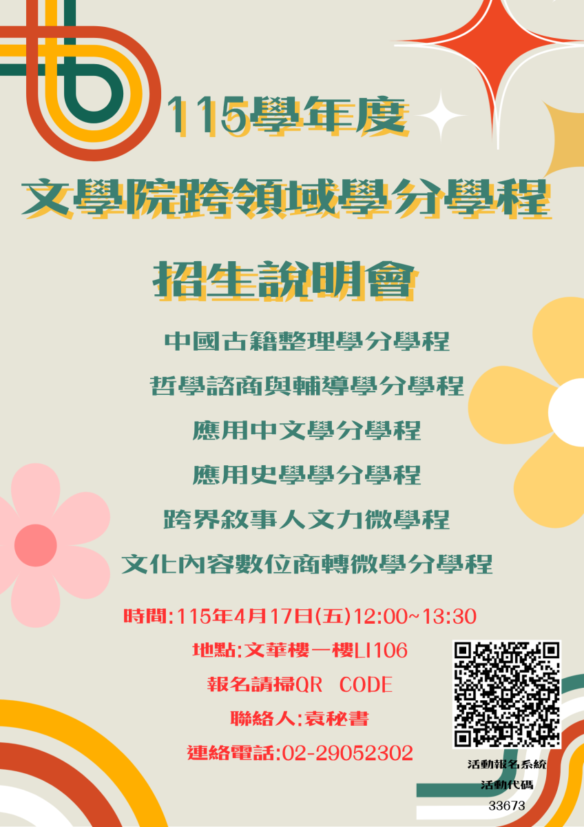 文學院跨領域學分學程說明會訂於115年4月17日(五)中午12:10舉辦,地點:文華一樓LI106教室。如有任何疑問,也歡迎來電、來信詢問,秘書都可以詳細回答您的疑問唷。