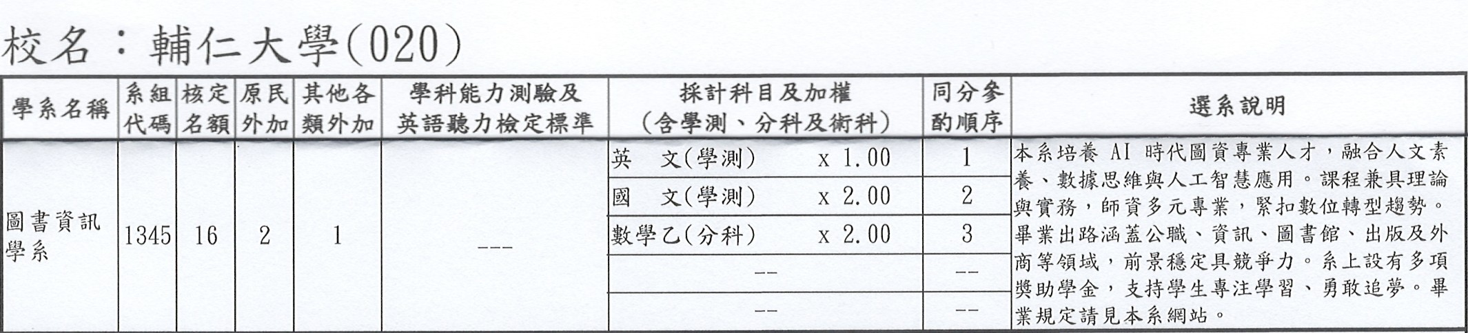 114學年度輔仁大學圖書資訊學系寒假轉學生招生 (詳細資訊以輔大招生委員會公告之規定為準)