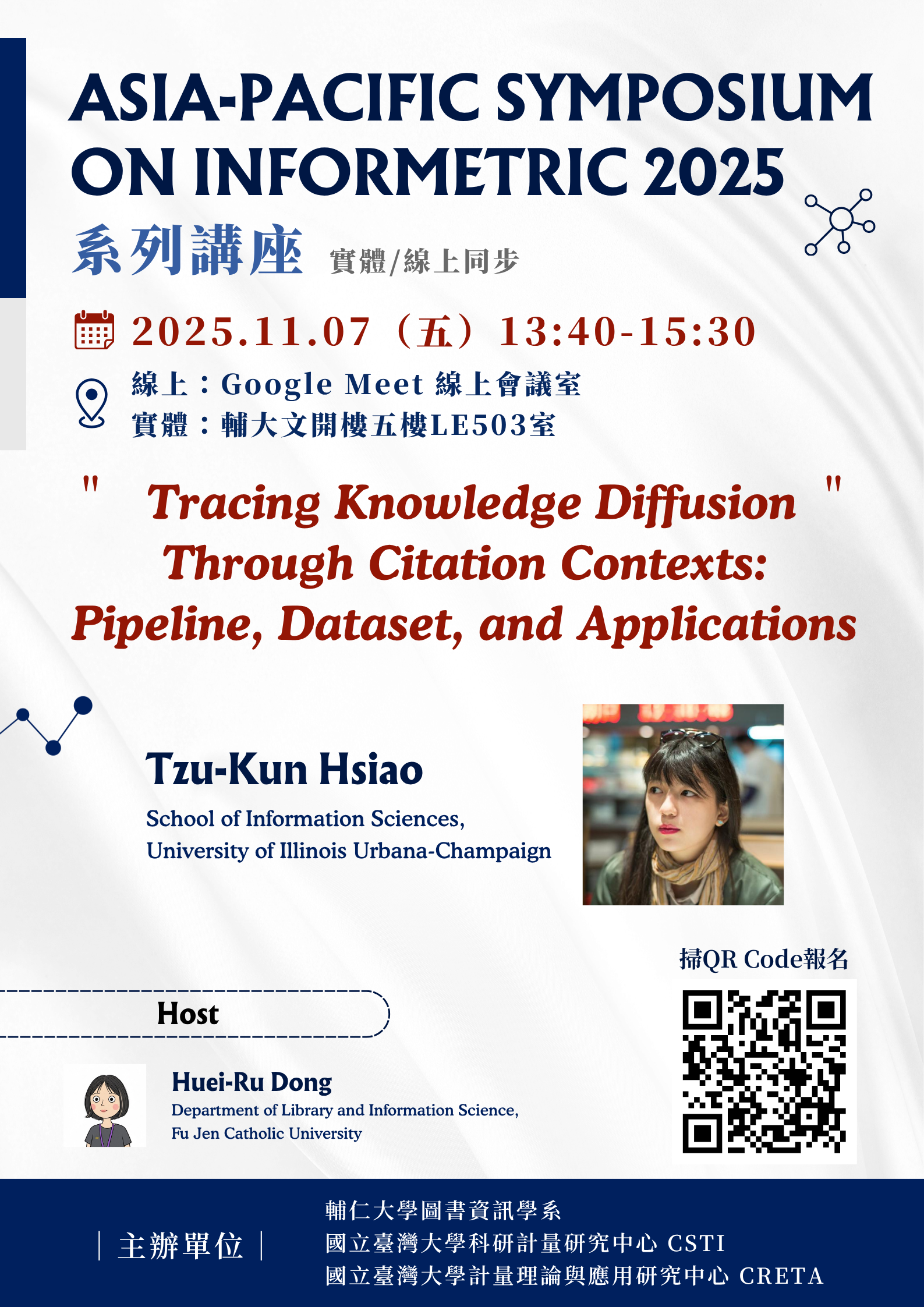 本系邀請伊利諾大學香檳分校 (UIUC) 圖書資訊學研究所博士候選人 Tzu-Kun Hsiao進行專題演講,報名網址與相關資訊如下,誠摯邀請本系師生及同道參加!