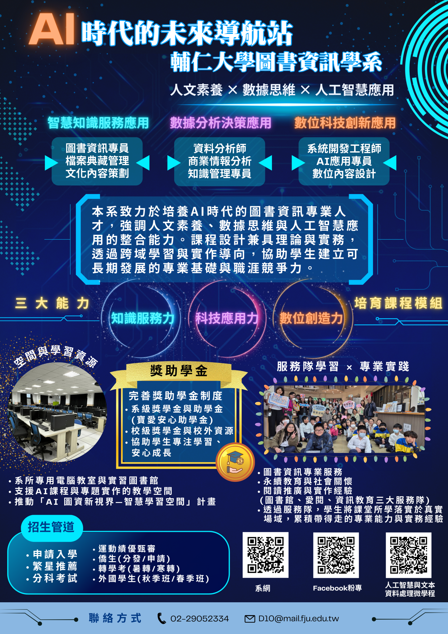 【探索圖資、從當下起航,展開你全新的職涯發展】 歡迎申請入學考生來了解本系優勢、職涯發展與就學環境,將本系列入第一志願唷! (一)日 期:115年05月29日(星期五)下午13:30~15:30 (二)地 點:新北市新莊區中正路510號 輔仁大學文開樓1樓LE106(詳見文開樓位置圖) (三)報名網址:預計115年5月6日公告 (按此連結) (四)報名期程:115年5月6日至5月18日(下午16:00)截止 |
